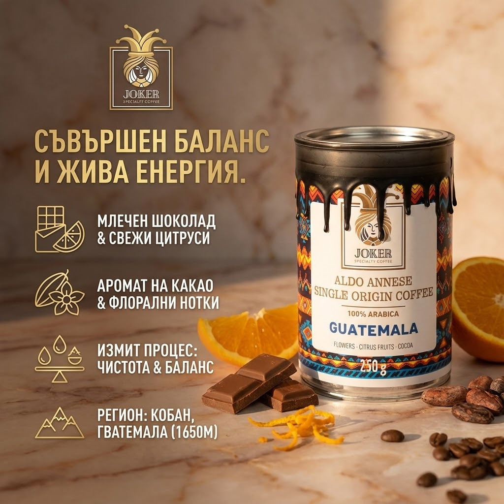 Открийте съвършения баланс на вкус и аромат с кафе Guatemala Aldo Annese – уникално кафе от сърцето на Гватемала, създадено, за да удовлетвори и най-взискателните ценители.